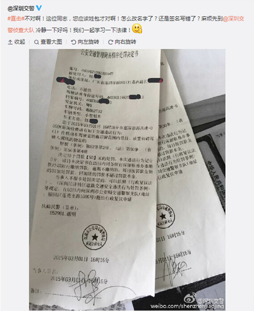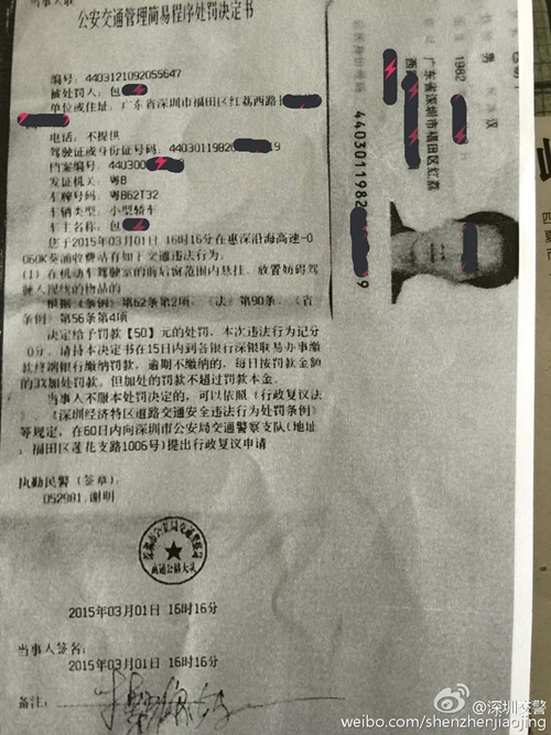 近日有媒体报道称,3月1日深圳交警部门在惠深沿海高速葵涌收费站设卡查车时,男子包某因在机动车驾驶室的前后窗视线范围内悬挂放置妨碍驾驶人视线的物品,被处以罚款50元、记0分的处罚。而在处罚决定书上签名时,包某并没有签上自己的名字,而是签上了脏话。