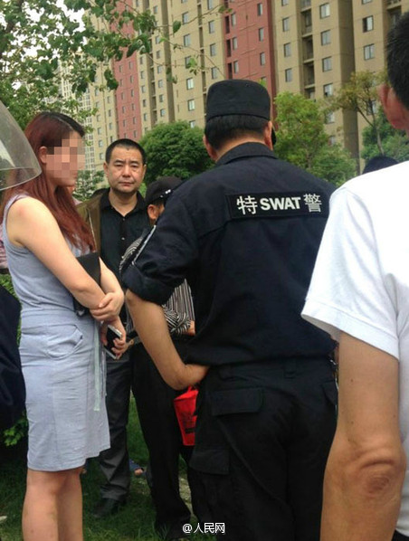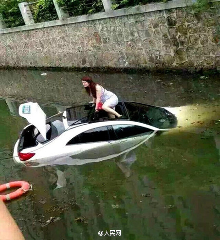 5月14日16时许,江苏无锡市北塘区金太湖国际城附近道路上,一名女司机因操作不当,驾驶着白色奔驰车飞速冲入了路边的河道中,所幸女司机第一时间从天窗逃生,随后被过路群众及消防官兵救出,女司机除惊吓外毫发无伤。目前,当地交警部门正在现场调查处理。中新社发 张瑞 摄