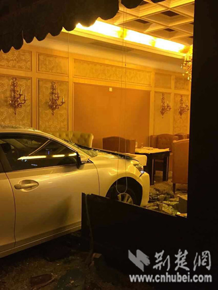 网民上传的图片显示,一辆白色雷克萨斯轿车在撞毁酒店一侧墙壁和整面玻璃后,车头几乎全部冲入餐饮店内部,被撞碎的玻璃和瓷砖等散落一地。