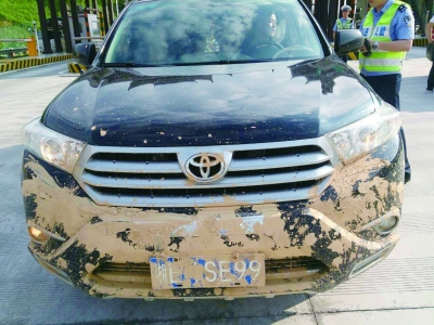 6月15日下午,高速交警在怀化市绕城高速怀化南收费站对车辆进行检查登记时,一辆黑色丰田越野车引起了民警的注意,该车引擎盖和两侧都比较干净,但是前后牌照处被大量的泥污覆盖。