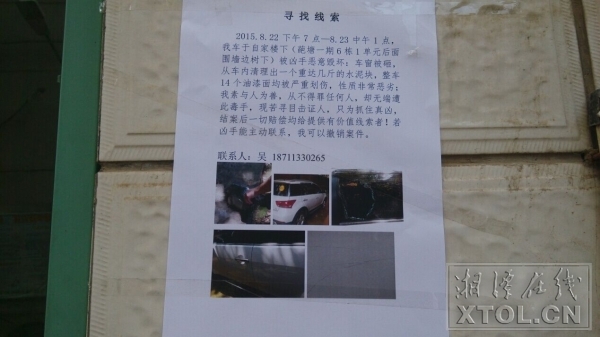 车子被损后吴先生立即报案,岳塘区派出所已现场勘查,目前尚在侦查中。吴先生也贴出了告示,希望能找到提供线索的人。