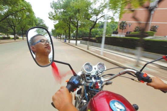 8月27日,湘潭大学,王朱朱在校园里开着他新买的三轮摩托车。开学在即,他驾驶着这辆摩托车从陕西老家返回到学校,历时五天。图/记者 华剑