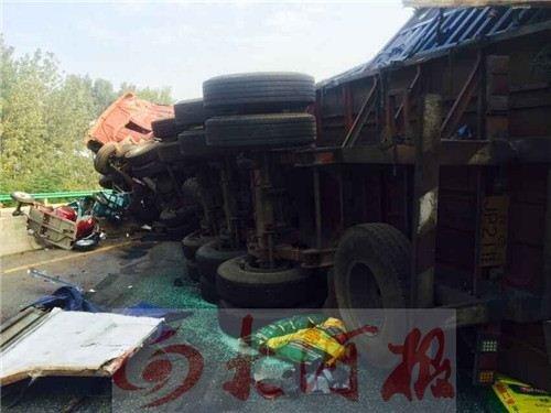 据了解,车祸是由于前方的交通事故造成堵车,随后这辆拉化肥的货车在超车货车过程中连挂4辆车,这辆救护车是从江西南昌安义县人民医院过来的,要将病人转到北京去。