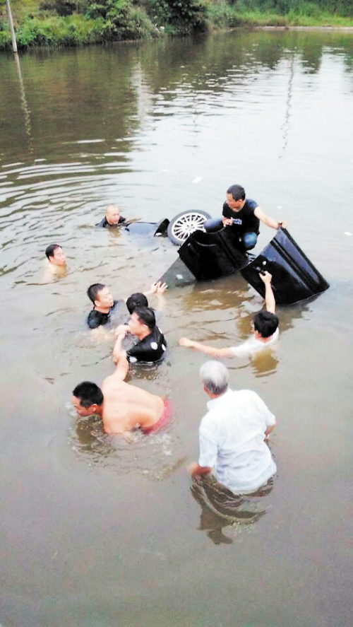 (众人下水抬车,拉开车门,救出车内的人。图片由秦秀波提供)