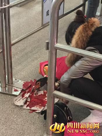 1月19日上午10时许,来自北京的王先生来到成都东客站准备乘车。沿着指引他从C口进站后经过验票,朝前走向安检的位置。快走到安检机的时候他注意到,一名20多岁的女子蹲在角落,手持一把10厘米左右长的短柄水果刀;她脚边的口袋中一只鸭子探出脑袋,鸭脖子正在滴血。