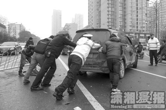 1月21日,香樟路上发生一起三车相撞的车祸,市民正协助交警将事故车辆推开。图/记者 谢长贵