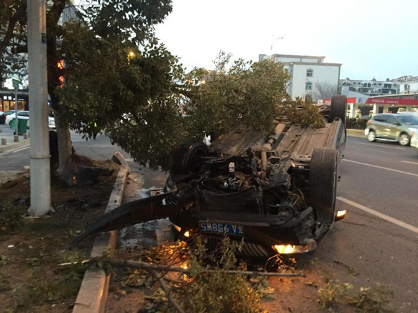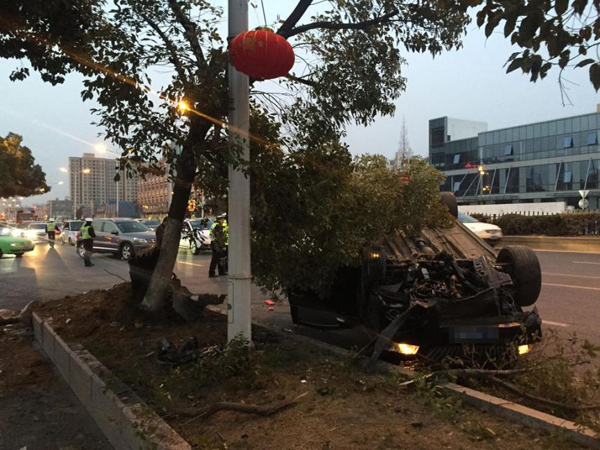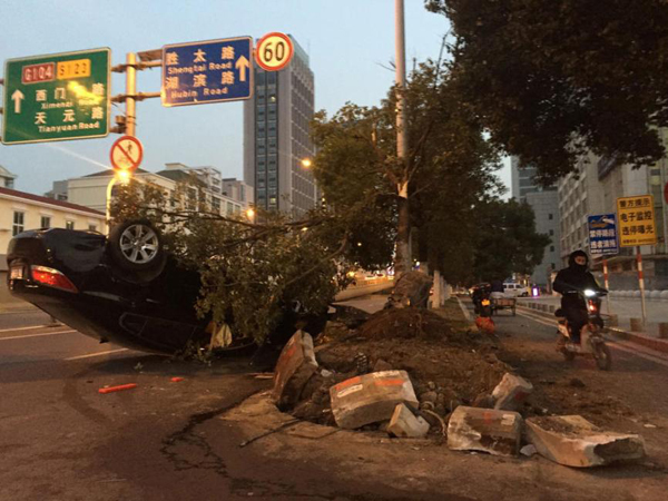 2016年2月20日,江苏南京,晚上5:40在江宁区双龙大道与胜利路路口由北向南,一辆别克轿车撞击绿化带将一颗树连根拔起后车辆四轮朝天翻车,一家三口从车里爬出,庆幸没有受伤。