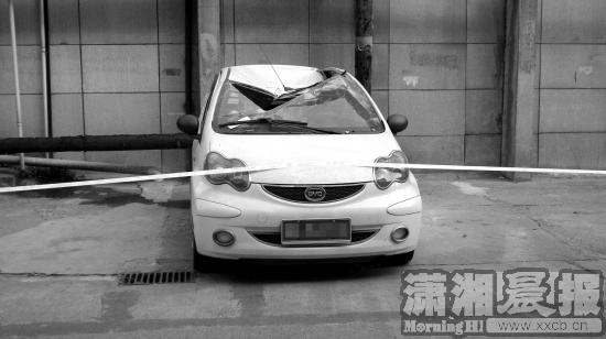 事发现场位于桐荫里小区南侧,靠近迎宾路的桐荫里巷。2月29日上午11时许,记者在现场看到,出事的是一辆白色比亚迪两厢车,车头朝南停在桐荫里小区一栋高楼南侧,车顶被砸凹陷,前挡风玻璃破碎,车顶上遗留着一块宽20厘米左右、厚两三厘米的水泥块。