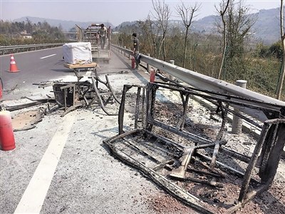 重庆晨报3月2日讯(记者 张旭)在驾驶途中抽支烟,竟然引发一场火灾。更要命的是:烟头点燃的是自家的车。这是昨天中午发生在高速路上的真事。现场:高速路上货车起火
