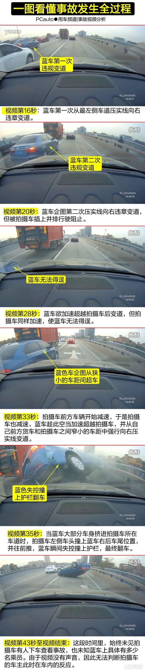事发路段为一段三车道的快速路,从视频可以看到事发时该路段车辆相对较多。蓝车一开始从最左侧车道压实线违规向右边变道超车,当变到中间车道后,紧接着要第一次从中间车道准备往最右侧车道变道时,受到拍摄车的阻拦没有变道成功。紧接着在拍摄车和前方卡车刹车的间隙,蓝色车企图第二次违规变道,而这一次由于两车相隔太近,与拍摄车发生碰撞。因为车速较快,碰撞后蓝色车直接发生了翻车。