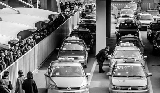 3月14日,高铁长沙南站,乘客在出租站台候车。当日,交通运输部部长杨传堂等答记者问时谈出租车改革。图/记者 杨旭