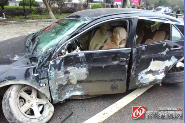 当天肇事车就是这辆牌照为湘N00877的广本雅阁,从事故处理民警拍摄的照片可以看到,这台轿车驾驶室一侧车门严重凹陷,两个前轮爆胎,车辆前后轴柱断裂,车辆后保险杠脱落,排气管也掉在地上,车下一大片血迹,可见当时事发时的恐怖和惨烈场景。