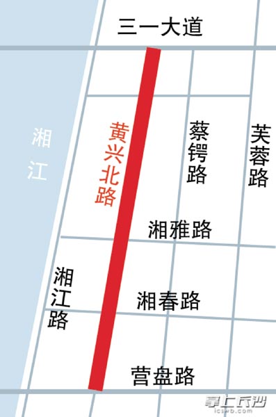 黄兴北路由营盘路拉通至三一大道,贯通南北。目前,营盘路以北至三一大道以南,从芙蓉路至湘江路1.5公里距离,没有一条南北向主干道,致使这一片区交通压力巨大,经常造成拥堵。黄兴北路建成通车后,不仅方便沿线居民出行,对减轻周边道路交通压力也大有裨益。今后,市民可沿着黄兴北路一路向北,走波隆立交桥就能直上三一大道。