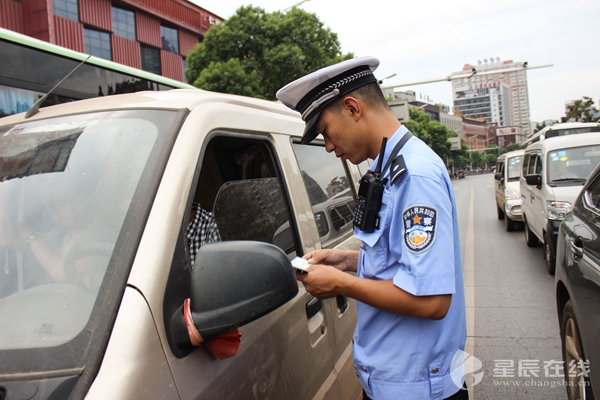 (雨花区交警大队四中队副队长彭启鹏查处违章车辆。图片由见习记者 李海清 摄)