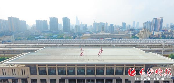 12日下午,记者来到长株潭城际铁路长沙站看到,站房顶上的铭牌已安装完毕,铭牌上的“长沙”两字与隔路相望的长沙火车站的铭牌一样出自毛泽东的手迹。长沙晚报记者 余劭劼 黄启晴 摄影报道