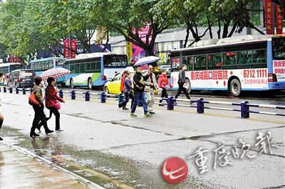 重庆晚报记者在这里看到,尽管有道路隔离设施横在马路中间,仍有许多行人抬脚跨越隔离栏杆而过,不少还是三五成群,你拉着我,我牵着你,结伴乱穿公路。