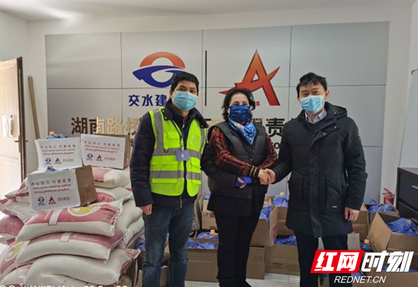 湖南交水建集团和旗下湖南路桥公司向海外项目捐助物质。