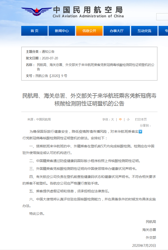 民航局、海关总署、外交部关于来华航班乘客凭新冠病毒核酸检测阴性证明登机的公告