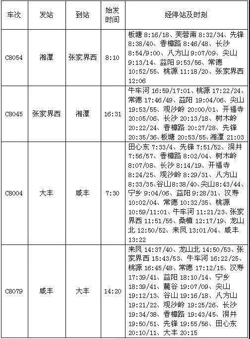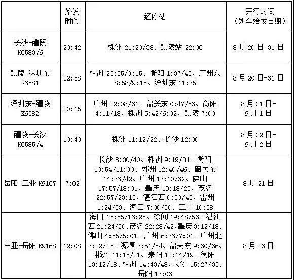 时刻新闻 —分享— 据了解,自8月20日起,广铁集团将陆续新增6趟旅客列车经停株洲火车站。主要往醴陵、深圳、三亚方向。具体开行情况如下:同时,株洲(大丰站)往张家界方向的城铁动车为每日开行,具体开行情况如下: 来源:株洲发布 编辑:曾拥璇