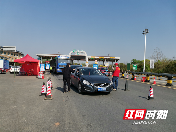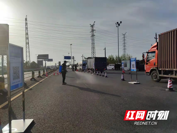 从疫情初期,由长沙县回龙村村组人员、县疫情防控指挥部、地方交警及派出所人员组成的临时防疫小组就驻守在松雅湖收费站外广场,对每一台货车进行消毒,同时对所有下站的车辆扫场所码、检查双码,对于黄红码的人员要求第一时间下车到站临时棚中进行核酸检测才能离开。