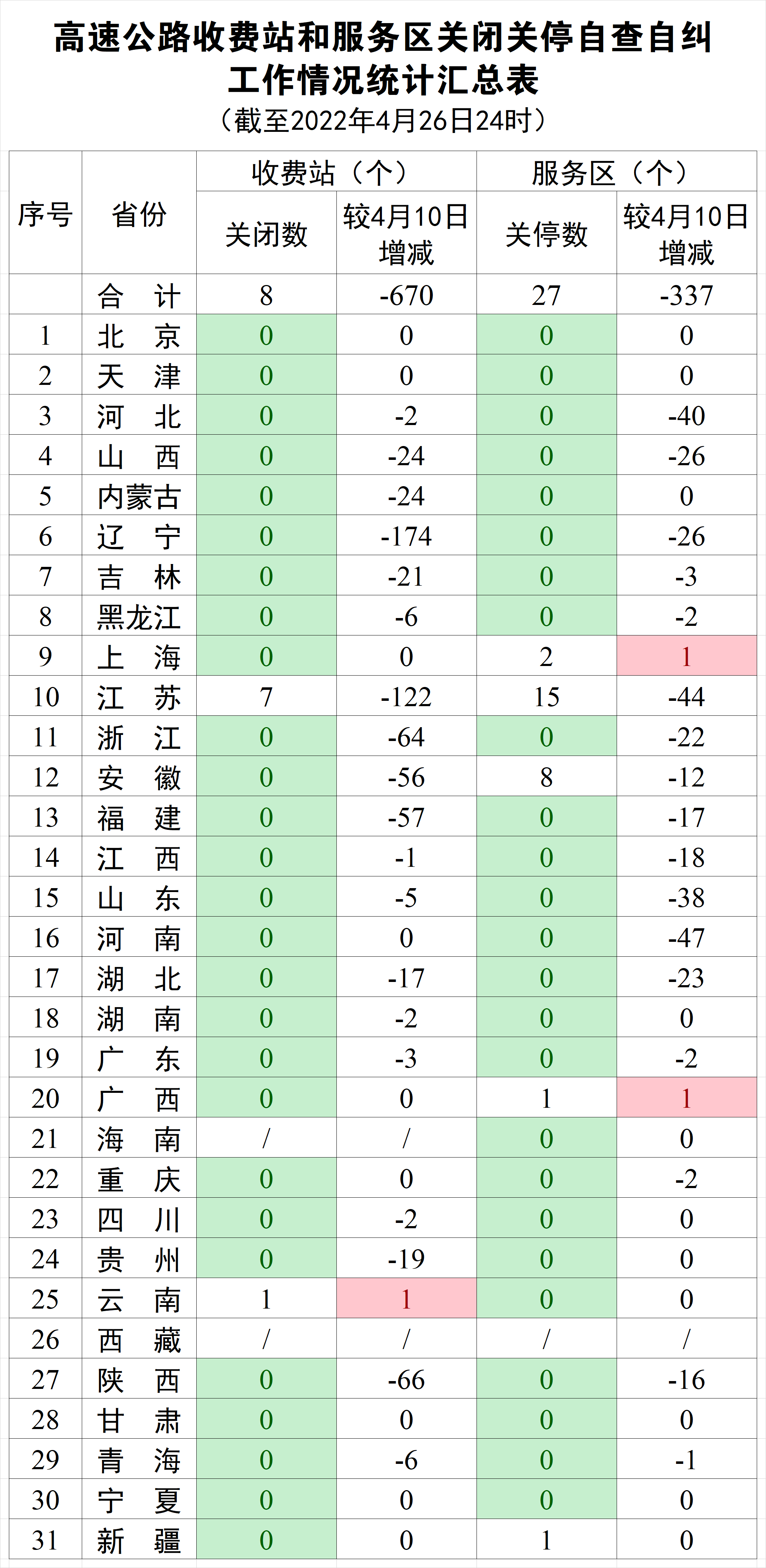 根据各省(区、市)上报数据汇总统计,受疫情影响,截至2022年4月26日24时,各省(区、市)高速公路共关闭收费站8个,占收费站总数的0.07%,比4月10日减少670个,下降了98.82%;共关停服务区27个,占服务区总数的0.41%,比4月10日减少337个,下降了92.58%。除西藏(无高速公路收费站和服务区)外的30个省(区、市)中,北京、天津、河北、山西、内蒙古、辽宁、吉林、黑龙江、浙江、福建、江西、山东、河南、湖北、湖南、广东、海南、重庆、四川、贵州、陕西、甘肃、青海、宁夏等24个省份已无关闭关停的高速公路收费站和服务区。