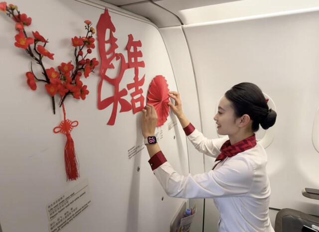 (春节当天湖南航空乘务员布置主题航班客舱。)