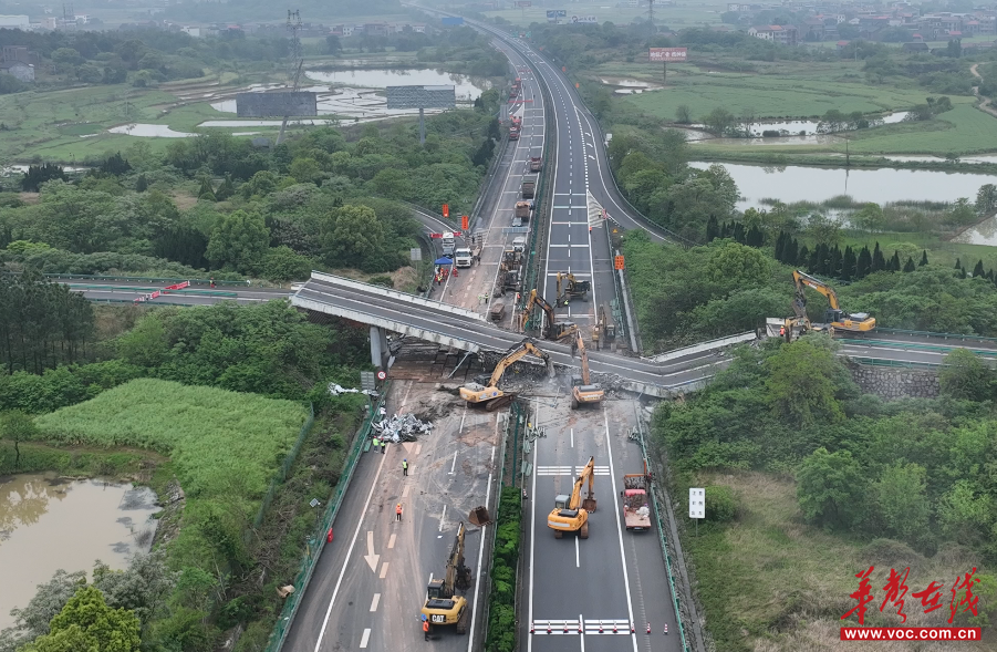 挖机挥舞、炮机轰鸣,4月23日,G4京港澳高速株耒扩容项目按照施工计划,完成23座主线跨线桥集中拆除。